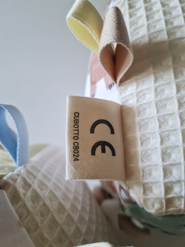 Cubo sensoriale composto da sei facce di diverse stoffe e composizione. Permette di stimolare i diversi sensi del bambin* partendo dal tatto e la vista fino ad arrivare all’udito. Comprende un massaggiagengive in legno naturale con diametro e un sonaglino interno.